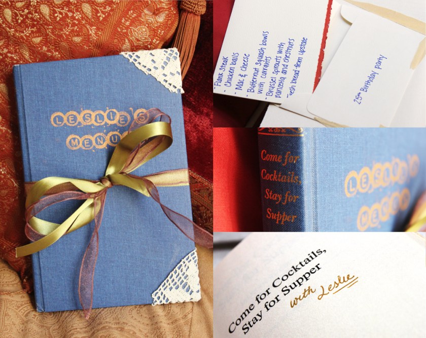 With the holiday season in full swing, it’s always nice to put forth a little effort and give gifts with an added personal touch. For my friend Leslie’s birthday, I thought it would be perfect to give a journal for recording all of her dinner recipes and party menus in one place. I found this 1970’s cookbook at the Skaneateles Antique Center. Personalizing the cover, and adding envelopes and cards from Kate’s Paperie to the blank pages, it not only has traditional American recipes from decades past, but a space for all those personal favorites to be added one meal at a time. You don’t have to be too crafty to put something like this together, just a few skills in the glue and stamping department and you have yourself a standout gift this season.