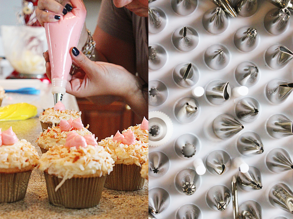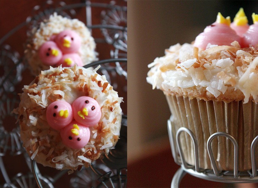 My girlfriends and I reunited back in Syracuse yesterday afternoon for a bake off to prep for a baby shower. Leave it to Martha Stewart for some inspiration for these bird cupcakes with toasted coconut flakes as the nest and hand piped buttercream frosting for the birds. A lot of laughs, frosting covered elbows and 195 piped birds later, we had one adorable dessert.