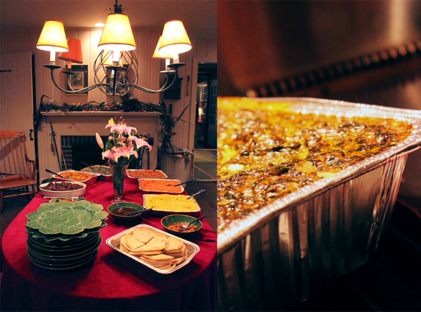 Saturday evening we gathered at Leslie’s for a holiday dinner party with a hugely successful menu. Vicky and Dario are visiting from Milan, so we not only gave them a taste of New York, but had a little bit of Italy with their eggplant parmigiana. Other dishes included cheese stuffed meatballs, spinach gnocchi, grilled gouda and apple sandwiches, pudding pasta, potato latkes and apple sauce, onion and mushroom bruschetta, salad and delicious cookies for dessert.