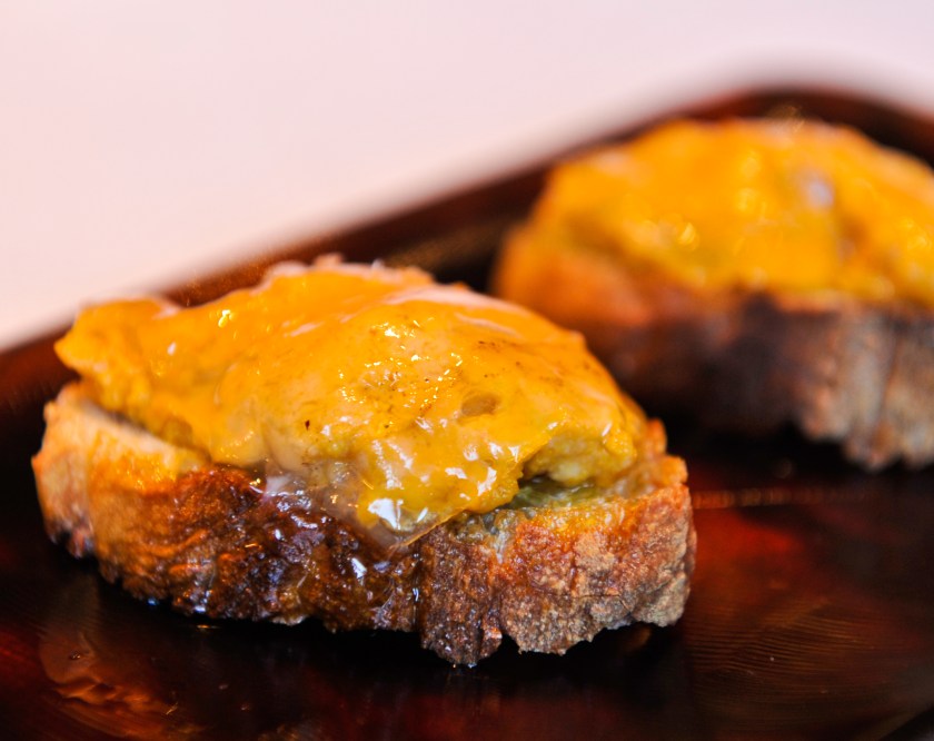 I have an obsession with those spiny little globular animal’s gonads. I can’t get enough of their creamy custard-like texture that dissolves on your tongue and tastes like a delightful ocean mist with a sweet after tone. Anytime, I hear about a restaurant serving up the best oceanic foie gras, especially one whose menu reads like a Jacque Cousteau book, a visit is a must. It took me two years to get there but Marea, and its warm sea urchin wrapped under a cashmere blanket of melted lardo, was well worth the wait.