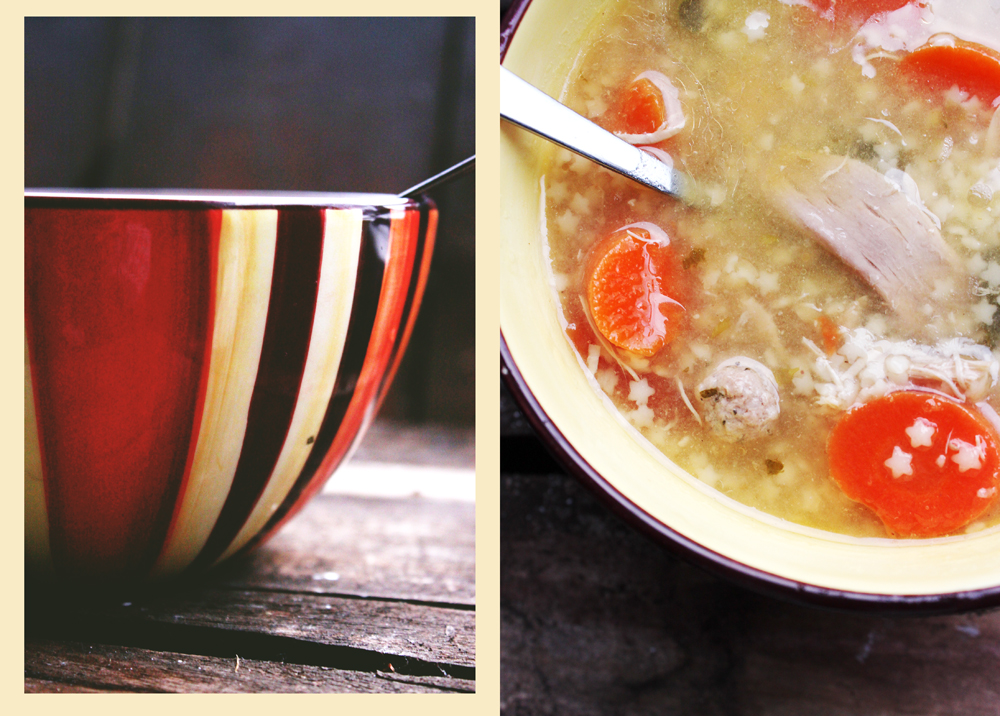 Combining my favorite ingredients from the traditional chicken noodle and Italian wedding, you get a fantastic mix of the best. I brown chicken, add in the chicken stock and water, and allow to cook for an hour and a half. Then putting in the vegetables- carrots, celery, kale and onions, I cook until tender. Next step is removing the chicken, debone it and add a box of pastina. Finally for the Italian wedding part, I take dime-sized cooked meatballs, stir in the mix and there you have a delicious bowl of soup.