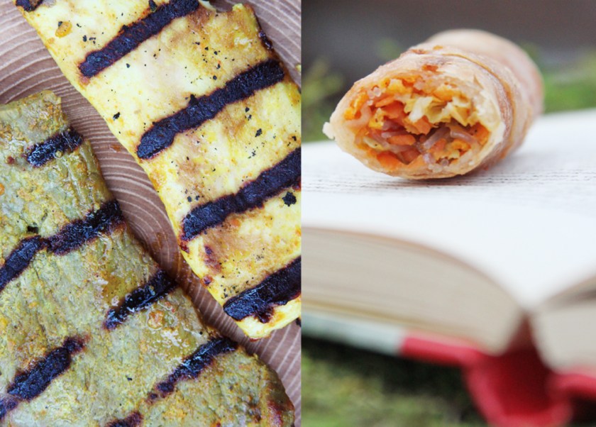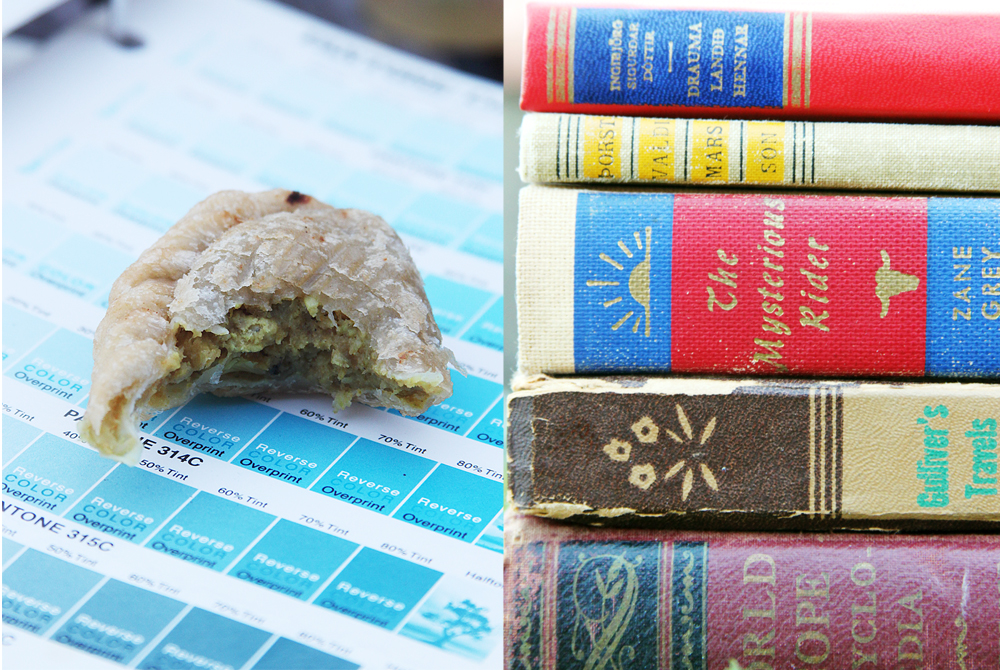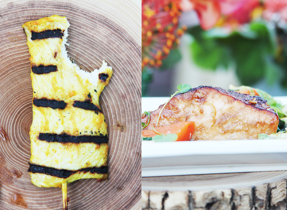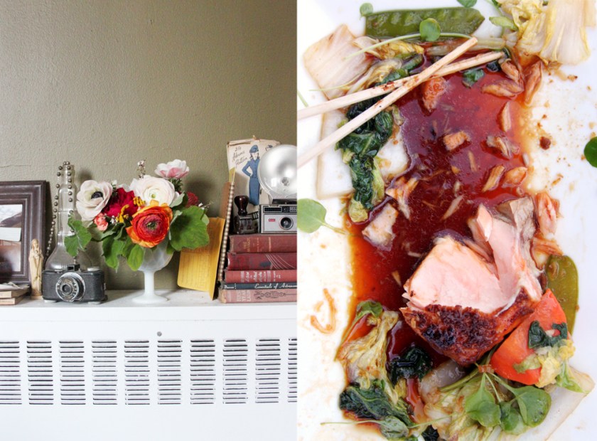 My friends and I took advantage of the unseasonably 60 degree sunny January day, and threw a little afternoon roof gathering with some of my favorite Thai food from Land and beautiful floral arrangements done by my friend, Jess. Using an old Pantone book and library books as inspiration, we shot Atlantic baked salmon with bean paste, napa cabbage, snow pea, carrot and caramel soy sauce, caramelized chicken curry puffs, root vegetable egg rolls and satay beef and chicken skewers before chowing down and catching those summer-like sun rays.